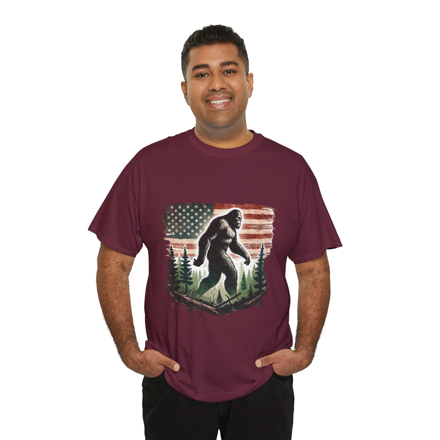 - Design: Bigfoot silhouette striding through a pine forest against a distressed American flag for a vintage, outdoorsy look